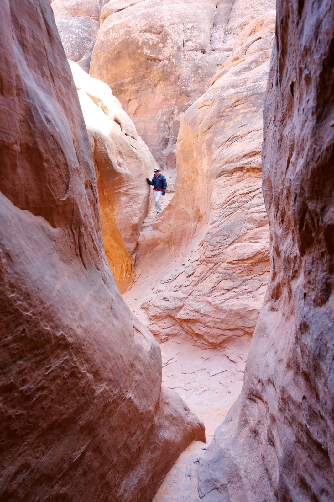 | Ken suns while Freebird explores slot canyons behind Sand Dune Arch. |